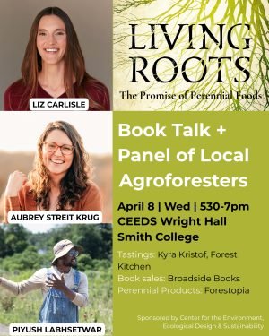 Join us on Apr 8, Wed at 530-7pm in CEEDS, Wright Hall of Smith College in Northampton for the book talk on “Living Roots’. Book incorporates perspectives from experts across numerous backgrounds and lived experiences to examine the promise of perennial foods with deep roots such as perennial grains, indigenous food forests, fruit trees, nuts, berries, and more for sustaining communities and protecting the health of our shared planet. Living Roots is an invaluable resource for sustainable farming advocates and everyone who cares about the future of food. Editors Liz Carlisle and Aubrey Streit Krug will join contributor Piyush Labhsetwar to introduce the book followed by a panel of local agroforesters who are building this movement in Western Mass. There will be an opportunity to taste some of the creative recipes which highlight the perennial ingredients thanks to artist and chef Kyra Kristof of Forest Kitchen which is a 9 year art project culminating in a FOREST FEAST on the Fall equinox of 2030. There will also be edible tree products marketed by Forestopia as well copies of the book for sale by Broadside Books.