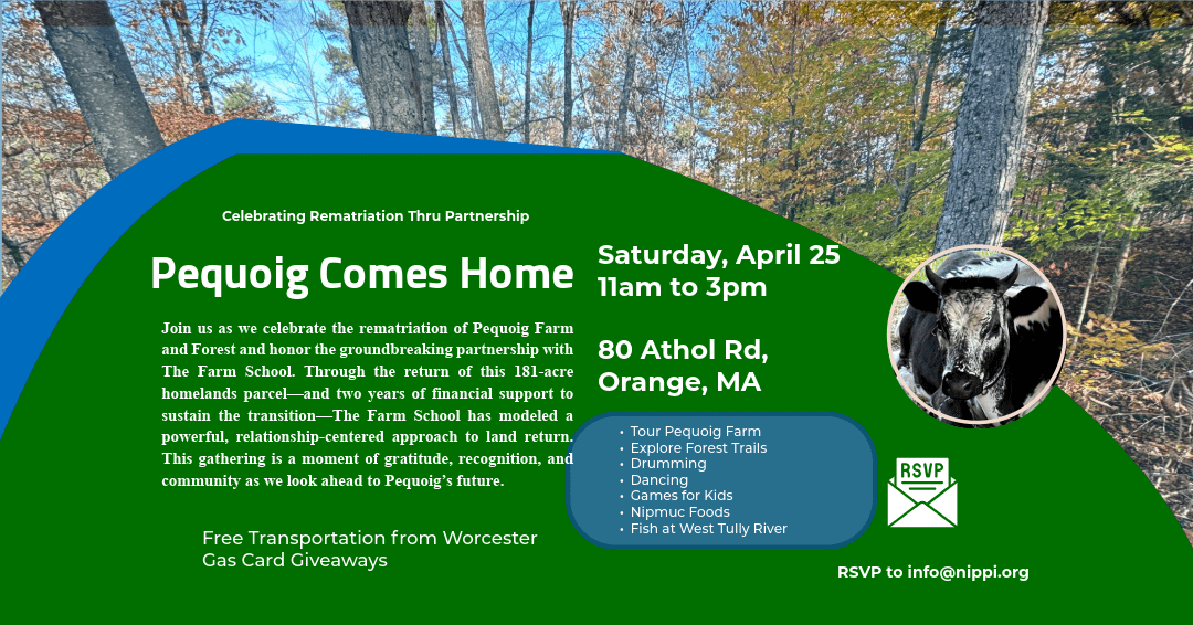 Join us as we celebrate the rematriation of Pequoig Farm and Forest and honor the groundbreaking partnership with The Farm School. Through the return of this 181-acre homelands parcel – and two years of financial support to sustain the transition – The Farm School has modeled a powerful, relationship-centered approach to land return. This gathering is a moment of gratitude, recognition, and community as we look ahead to Pequoig’s future.